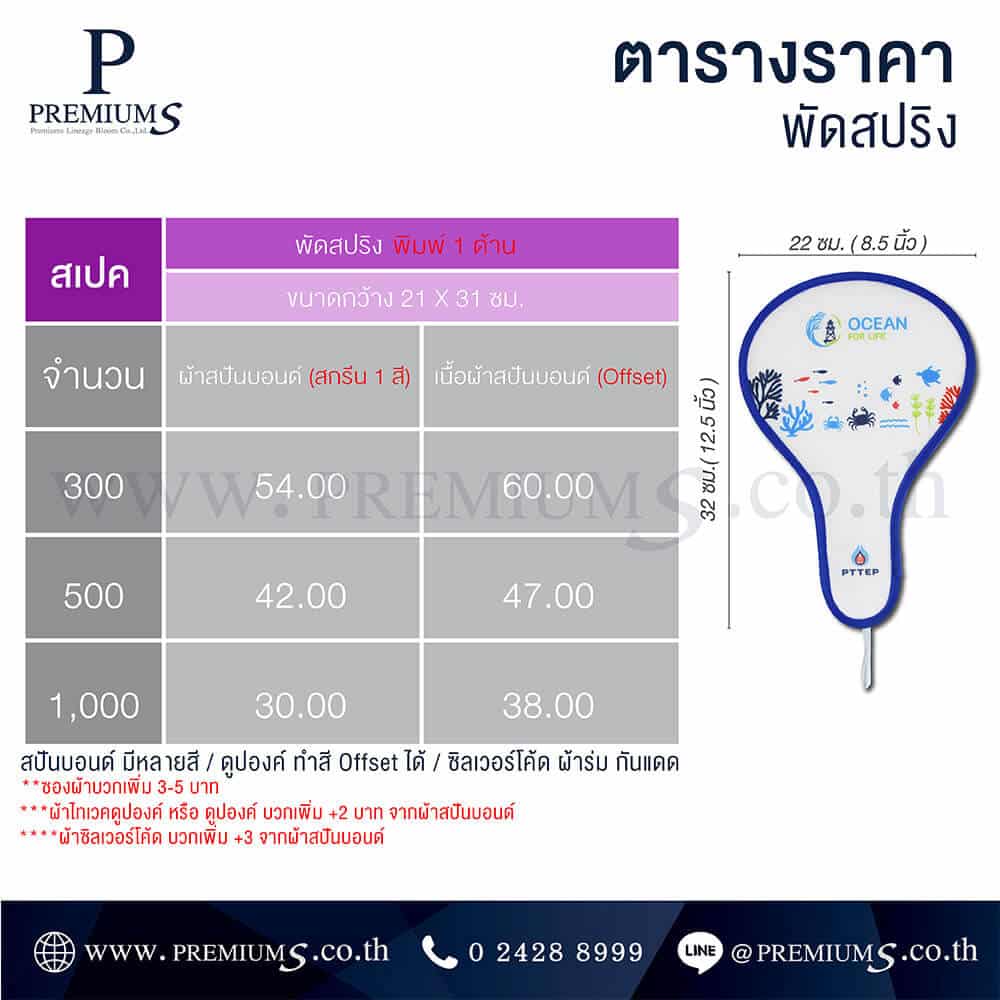 พัดสปริงพรีเมี่ยม สินค้าพรีเมี่ยม ของพรีเมี่ยม พัดสปริงมักพบเห็นบ่อยตามงานนิทรรศการ งานออกบูธอีเว้นท์ งานประชุม และงานโปรโมทแบรนด์สินค้า เนื่องจากพัดสปริงสามารถใส่ข้อมูลสำหรับประชาสัมพันธ์โปรโมชั่นสินค้า คิวอาร์โค้ดสแกนข้อมูลการติดต่อ พิมพ์รูปภาพ มาสคอต ข้อมูลติดต่อ ใส่ชื่อบริษัทหรือโลโก้ประจำองค์กร พัดสปริงเป็นของพรีเมี่ยม สินค้าพรีเมี่ยม ที่ใช้งานได้ทุกเพศทุกวัย มีเนื้อผ้ายืดหยุ่น สามารถพับเก็บได้ พกพาสะดวกและยังเป็นของที่ระลึก ของแจก ของขวัญปีใหม่ ของชำร่วย มอบให้ได้ในหลายๆโอกาสอีกด้วย