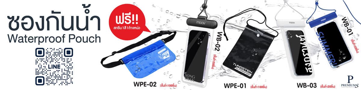 ซองกันน้ำ ซองใส่มือถือกันน้ำ และกระเป๋าคาดกันน้ำ เป็นอุปกรณ์กันน้ำสำคัญสำหรับเทศกาลวันสงกรานต์ และผู้ที่ชอบทำกิจกรรมหรือออกทริปท่องเที่ยว เช่น ทะเล น้ำตก ล่องเรือ ช่วยปกป้องโทรศัพท์และของมีค่าจากน้ำ ทราย และความชื้น ผลิตจากวัสดุกันน้ำคุณภาพดีปิดสนิท ใช้งานสะดวก ทำให้กลายเป็นของพรีเมี่ยม สินค้าพรีเมี่ยม โรงงานผลิตกระเป๋ากันน้ำ รับทำซองกันน้ำ รับผลิตซองใส่มือถือกันน้ำ และกระเป๋าคาดอก กระเป๋าคาดเอว มีทั้งพร้อมส่งและสั่งผลิต พร้อมสกรีนโลโก้ชื่อหน่วยงาน สำหรับทำของแจก ของแถม ของส่งเสริมการขาย หรือจำหน่ายทำแบรนด์ ช่วยเพิ่มมูลค่าสินค้าและสร้างภาพลักษณ์พร้อมกับการจดจำได้มากยิ่งขึ้น