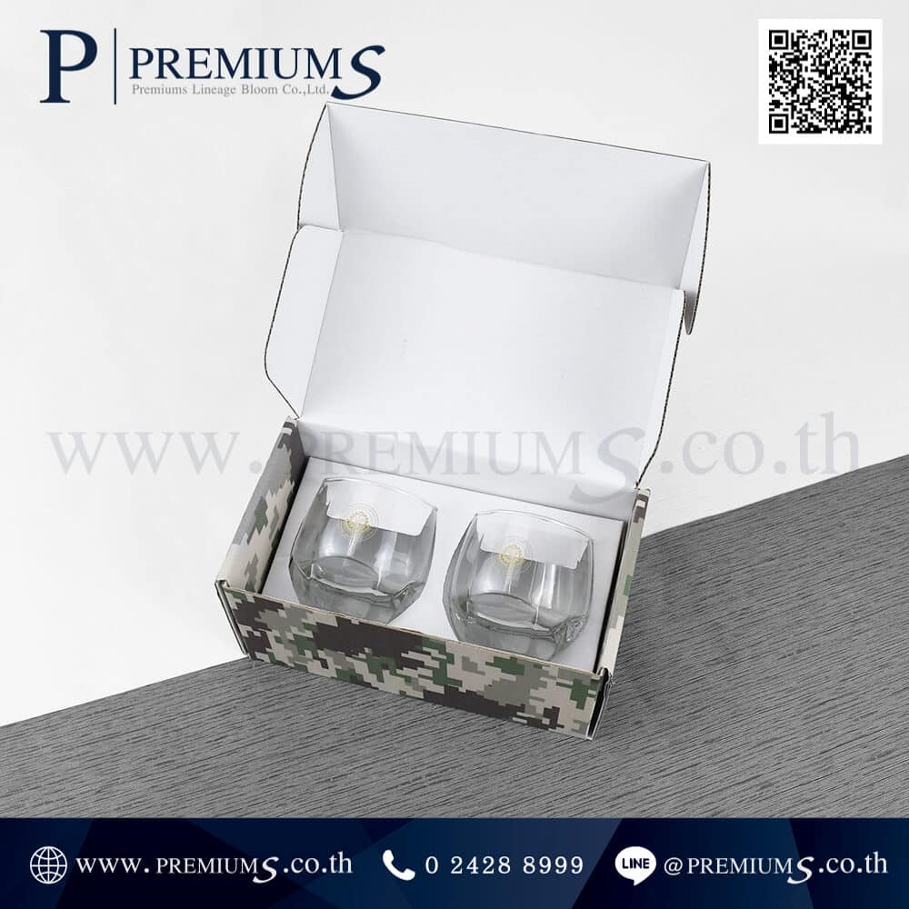 กล่องลูกฟูก : พิมพ์ 4 สี ฝาครอบเปิดบนทรงหูช้าง มีช่องล็อคแก้วด้านใน